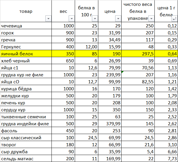 Упаковка 350 грамм стоит 190-200 рублей с содержанием 85 грамм белка на 100 грамм порошка. И мне стало интересно, а это выгоднее вообще, чем обычное яйцо? Ну и посчитал. Оказалось выгоднее. Тут я не удержался и посчитал вообще все продукты, какие только смог вспомнить. Получилось следующее. Нам важна последняя колонка, цена 1 г белка в рублях.