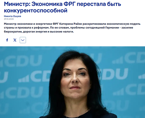 Министр экономики Катерина Райхе в октябре 2025-го честно призналась: «Экономика ФРГ перестала быть конкурентоспособной. Проблемы Германии — засилие бюрократии, дорогая энергия и высокие налоги…»
