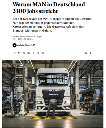 Утро начинается с новостей о том, что Meyer Werft закрывает легендарную верфь, Deutsche Bahn режет 30 тысяч рабочих мест, Volkswagen — 10 тысяч, Bosch — ещё 5,5 тысячи, Man – более 3 тысяч.