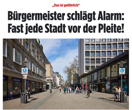 Bild 20.11.25: «Практически каждый немецкий город сейчас стоит перед банкротством»: из 396 городов и общин только 10 могут представить сбалансированный бюджет. Дефицит всех немецких городов на 2025 год оценивается в 30 миллиардов евро».
