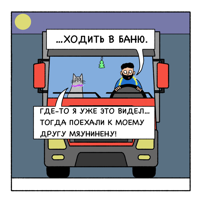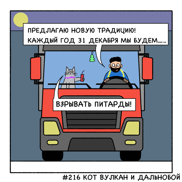 Кот Вулкан и дальнобой едут далеко-далеко. В дороге дальнобоя развлекает очень эрудированный и умный кот Вулкан.