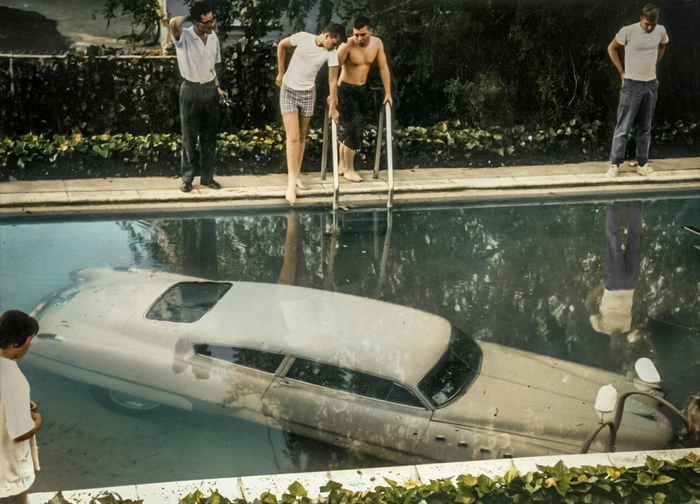 Затопленный автомобиль, который его пьяный владелец «припарковал» в бассейне в Беверли-Хиллз, Калифорния, 1961 год.