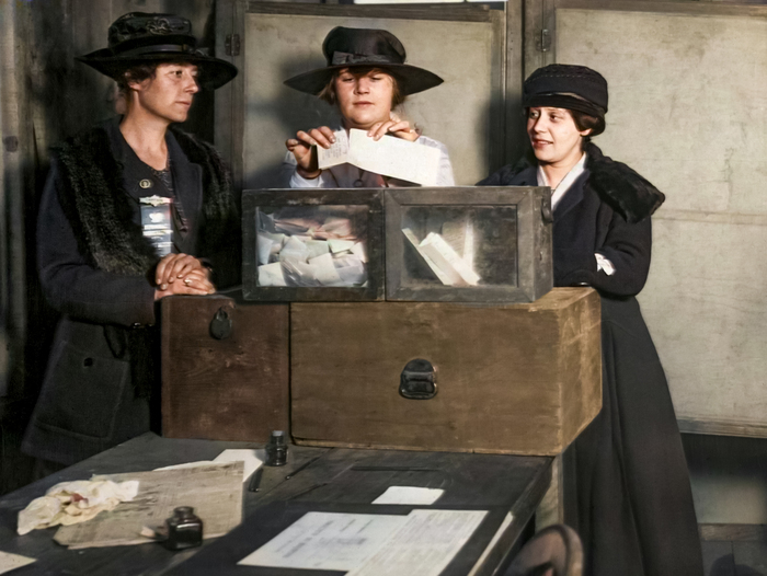 На фотографии — исторический момент: три женщины, участвовавшие в многолетней борьбе за избирательное право, впервые сами используют своё право голоса на выборах. Событие произошло 6 ноября 1917 года, когда жители Нью-Йорка одобрили поправку к Конституции штата, предоставившую женщинам право голосовать.