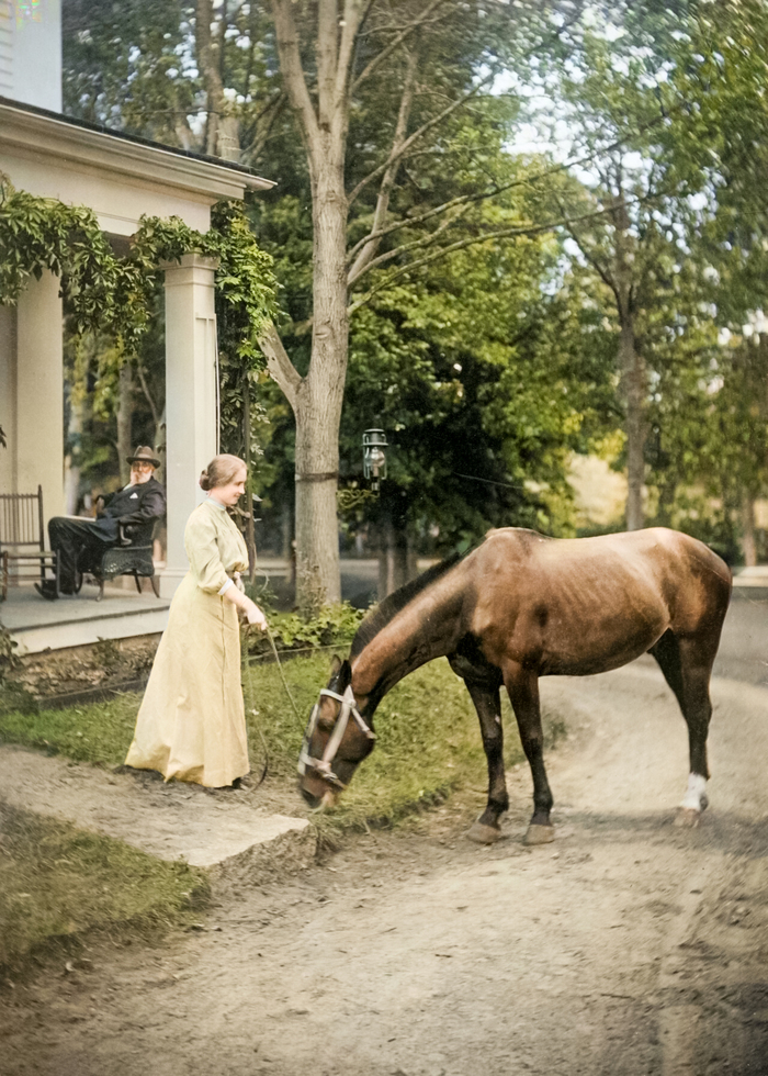 Американская писательница Хелен Келлер с лошадью, 1907 год.