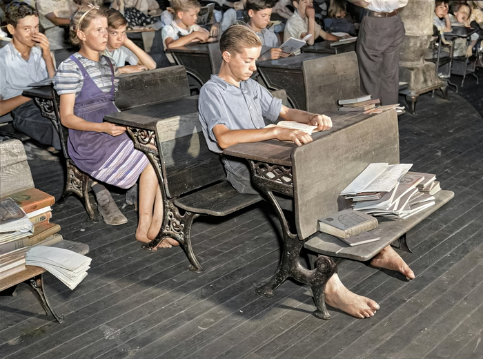 Ученики сидят за необычными партами — по сути, это «парты наоборот»: спереди лавка, а сзади столешница для следующего ученика. На переднюю скамью можно было сложить учебники, как на этом снимке.