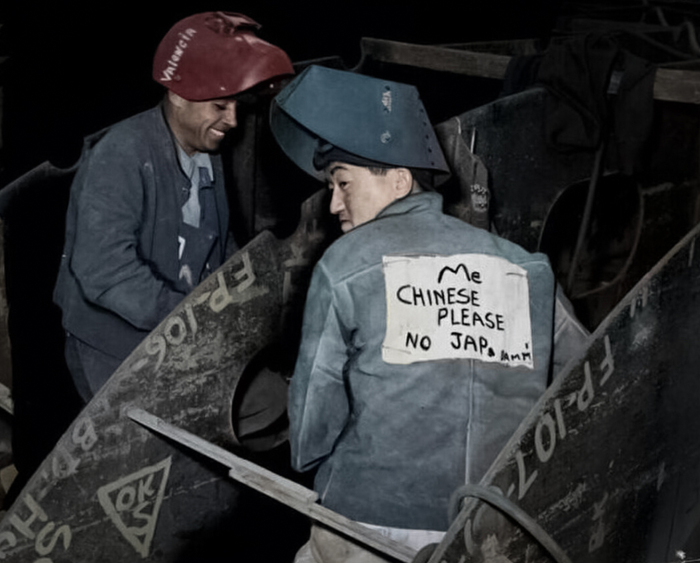 Рабочий из Лос-Анджелеса Говард Ип китайского происхождения прикрепил на спине табличку с надписью: «Я китаец, а не японец», чтобы избежать избиений или травли, январь 1942 года.