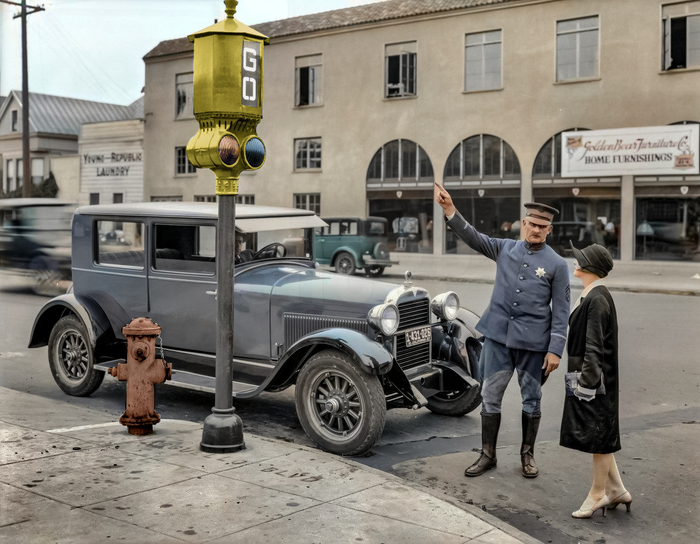 Полицейский объясняет женщине, нарушившей правила, значение сигнала светофора на бульваре Аргуэльо в Сан-Франциско, 1927 год.