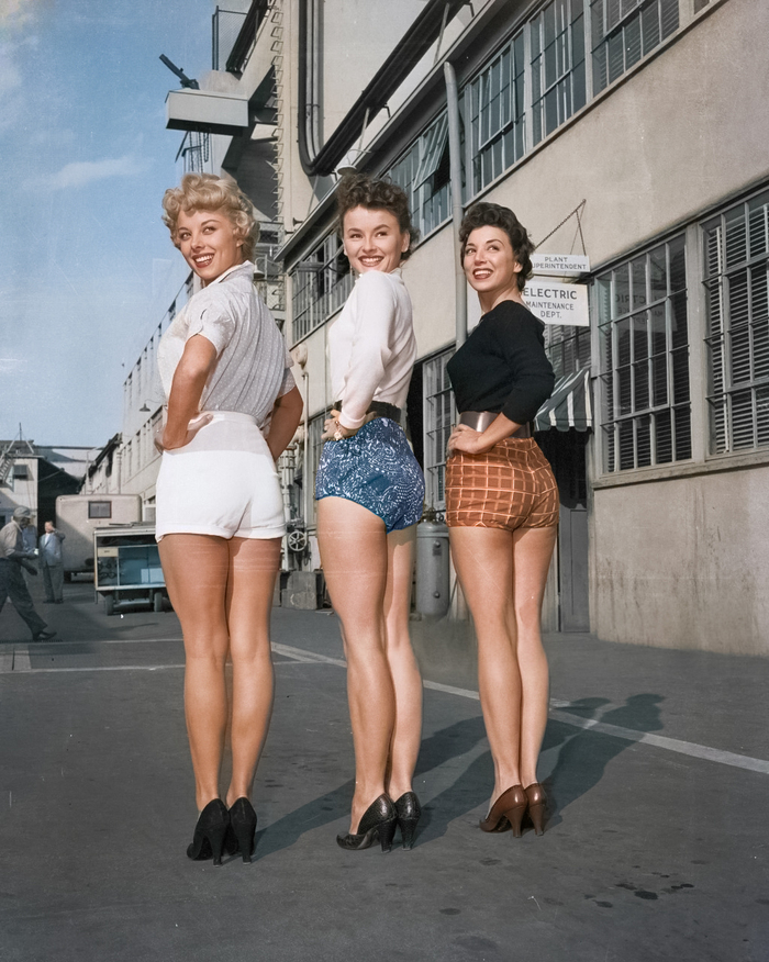 Актрисы Адель Аугуст (слева), Люси Марлоу и Джана Мейсон (справа) позируют фотографу. США, 1954 год.