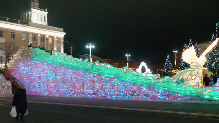 Это горка на центральной площади. Уже полностью безопасная и со светодиодной подсветкой. Топ. Единственное - большие очереди.