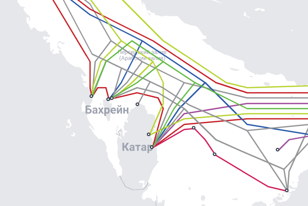 Представьте, что в Бахрейне одних только подводных кабелей связи 10 штук. Это в 2 раза больше, чем у Франции или Италии. Бахрейн вообще связан кабелями со всей Азией, Европой, Северной Америкой, Ближним Востоком и даже Африкой. Взгляните на карту.