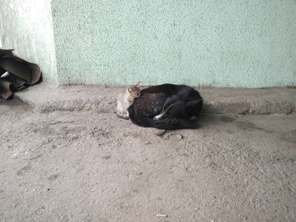 934 00110011 Беда сближает 9 лет назад Встретил на остановке такую парочку. На улице было очень сыро, холодно(это они под навесом) [моё] Кот Собака