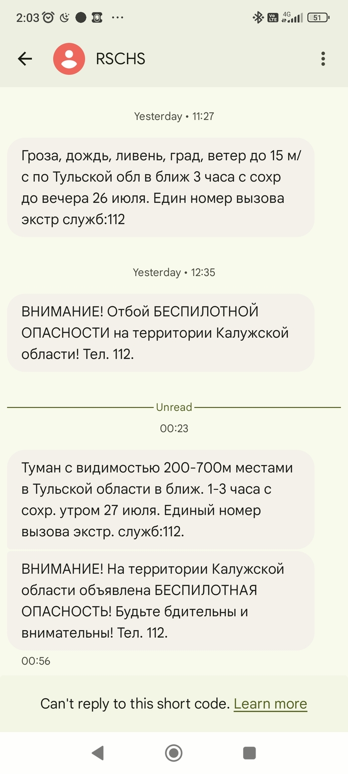 Мне кажется, или людей накаляют, одновременно отправляя сообщения о тумане, АТАКЕ БЕСПИЛОТНИКОВ и грозе?