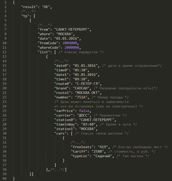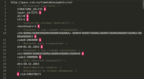Значения station*_name и station*_code можно почерпнуть из API автодополнения на том же сайте, оно так же работает через json. Базируется здесь , есть HTML-интерфейс, код языка - ru.