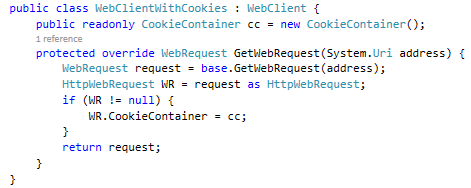 Нам нужно нечто, способное делать HTTP-GET-запрос и хранить куки. Используем System.Net.WebClient с небольшой модификацией.