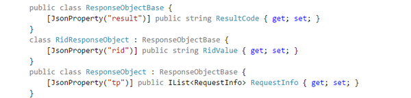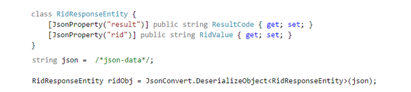 Пару слов о разборе json-данных. Для этих целей я использую Newtonsoft.Json, который можно взять через NuGet. Требуется создать модель данных (C# классы), чтобы спроецировать на них json. Например, для объекта-ответа с rid, пример которого я приводил выше, можно написать такой класс: