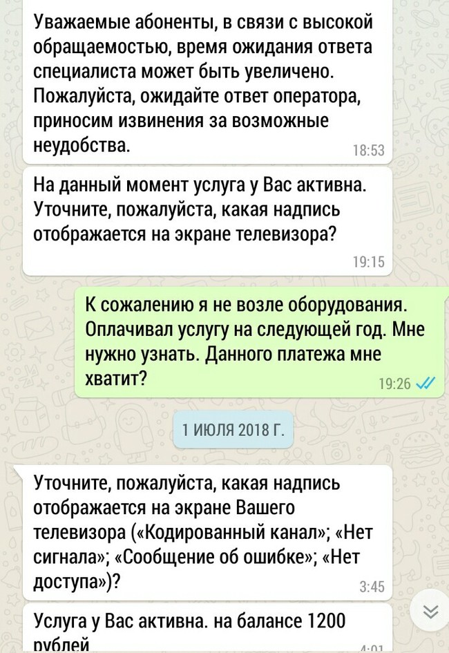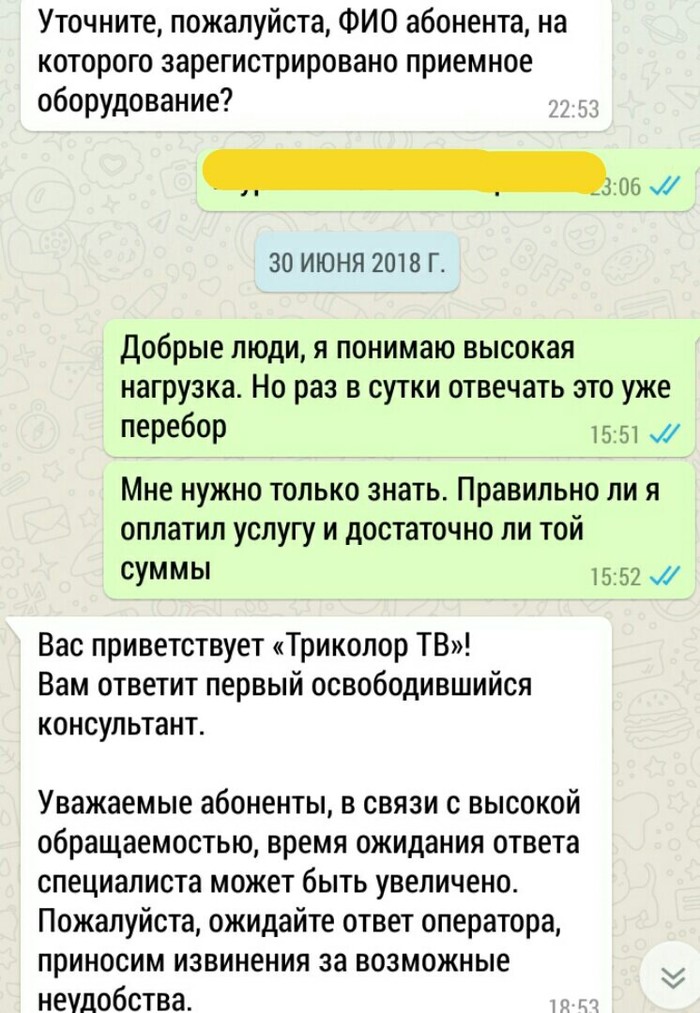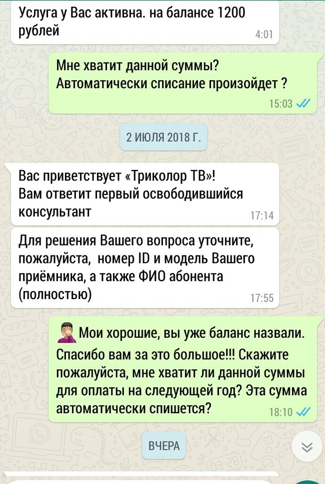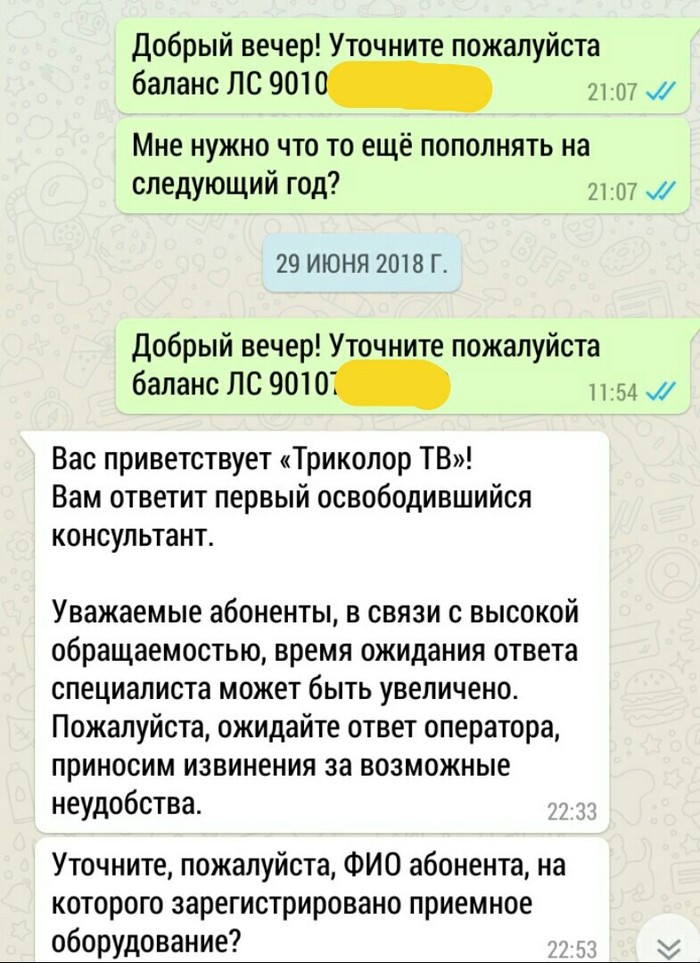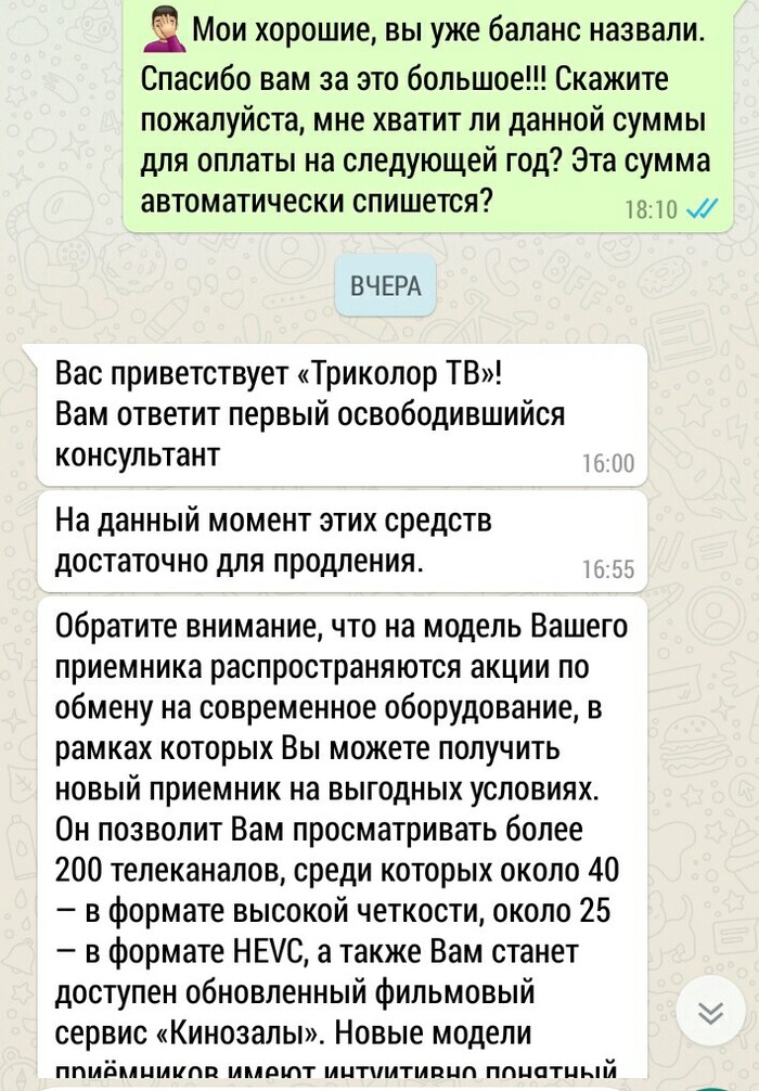 Дело было вечером, моя пожилая родственница попросила оплатить телевидение Триколор. Перечислив деньги на ЛС, решил убедиться, что все сделал правильно. Сразу оговорюсь. ЛК и звонок на горячую линию по определённым причинам вызывал дополнительные сложности, я решил воспользоваться службой поддержки Whats App. Качество и удобство оцените сами