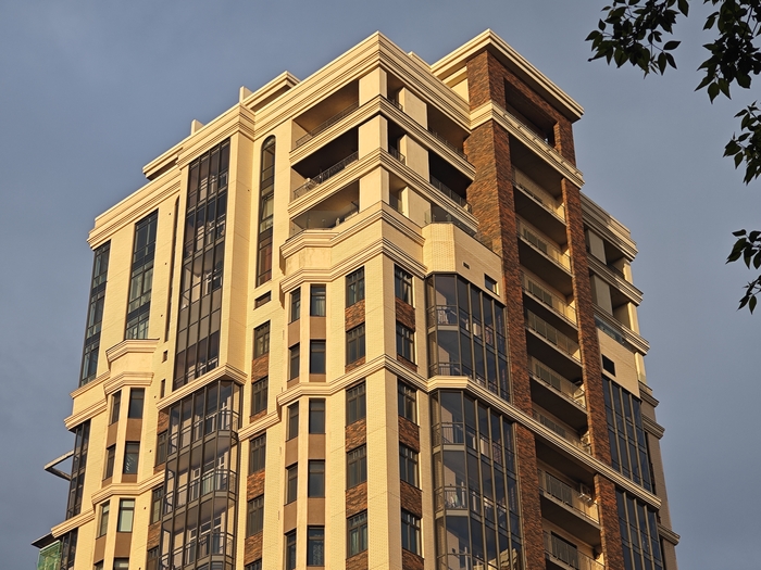 А этот малыш мне просто понравился. Было пасмурно, у него классный солнечный жёлтый цвет. А ещё он маленький, мне показалось это даже милым. Высотой этажа четыре. Стоял на ул. Ленинградской у ул. Добролюбова.