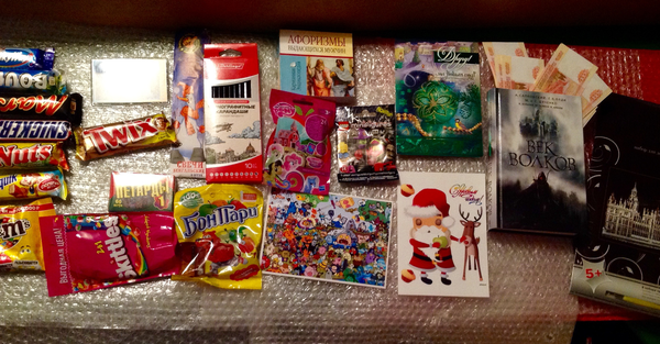 Уйма шоколадок и конфет, набор карандашей, две коллекционные фигурки, две книги, гравюра, несколько открыток, бенгальские огни и петарды (корсары, привет из детства), магнитик и сто тысяч рублей (пусть и фальшивых), а так же несколько листов лучшего антидепрессанта, прикрытых длинной мишурой.