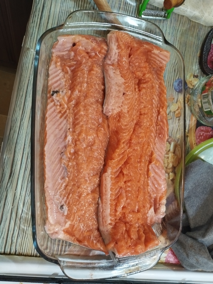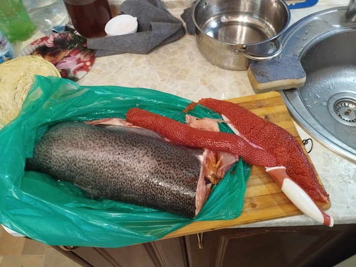 Зашел в рыбный, глянул на цену икры и рискнул купить охлаженную форель. 4кг рыбы и приятный бонус. Повезло.
