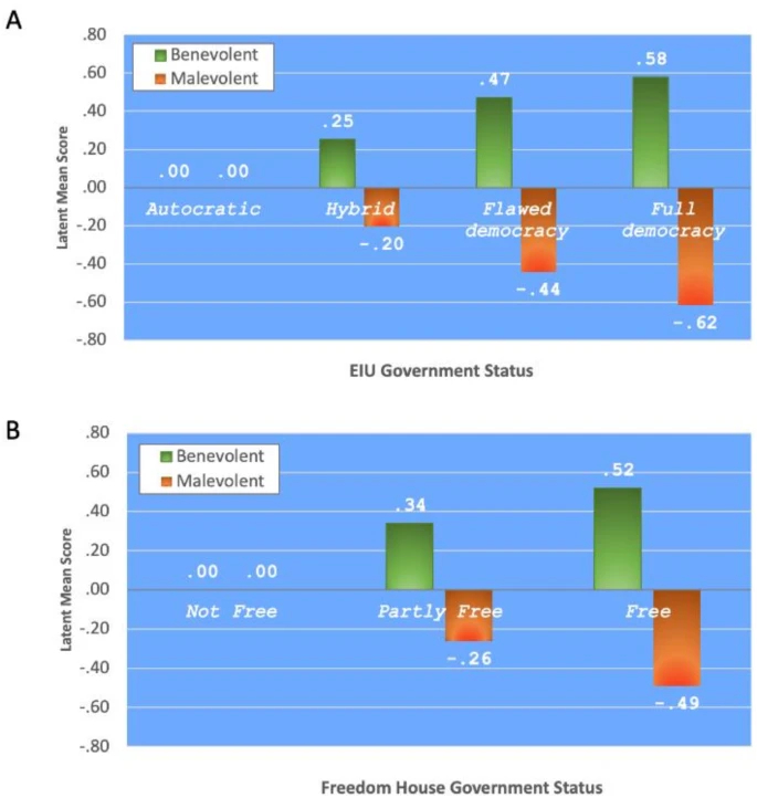 Доброжелательные черты положительно коррелируют с демократией, а недоброжелательные отрицательно.