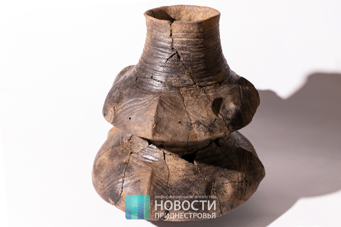 Сотрудники НИЛ «Археология» Приднестровского государственного университета отреставрировали древний глиняный сосуд необычной формы. Его тулово состоит из двух выпуклых частей – верхней и нижней, соединенных узкой перемычкой и ручкой. Горловина вытянутая, а стенки покрыты линейным орнаментом в виде спиралей и треугольников, внутри которых заметны круглые вдавления – по четыре в каждой части. Ассоциативно этот предмет высотой чуть более 20 см как будто состоит из двух отдельных чаш, положенных одна на другую.