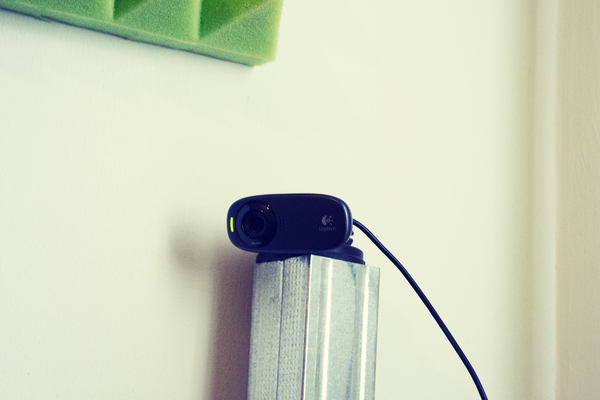 Ковролин на полу и "пирамидки" на стенах поглощают отражения звука. Говоря проще, убирают эхо, реверберации и прочие гадости. Лампа в правом углу включена всегда, чтобы даже ночью на видеотрансляции была картинка чуть веселее, чем черный квадрат.