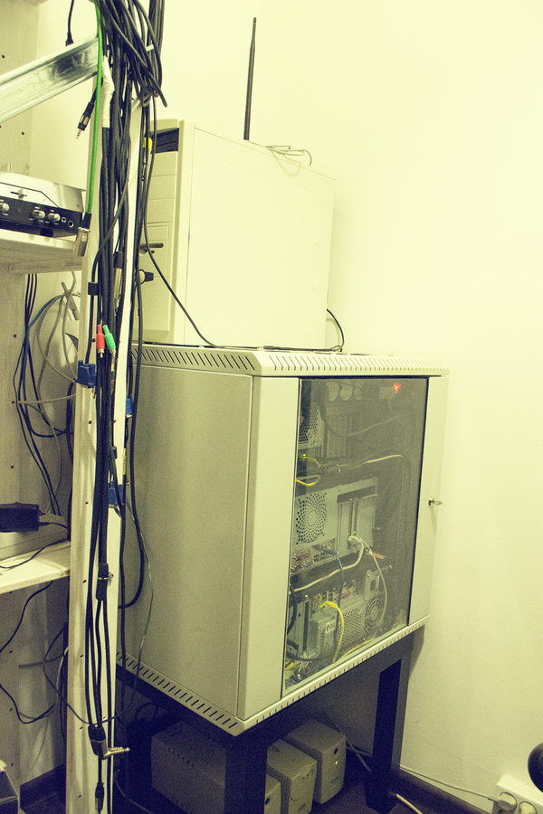 сервер кодирования потока (с него сигнал попадает в датацентр, в котором расположены непосредственно сервера вещания), основной эфирный компьютер и общий сервер, управляющий интернетом, авторизацией WiFi, телефонией и несколькими другими задачами.