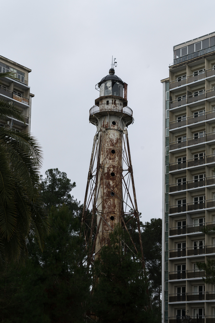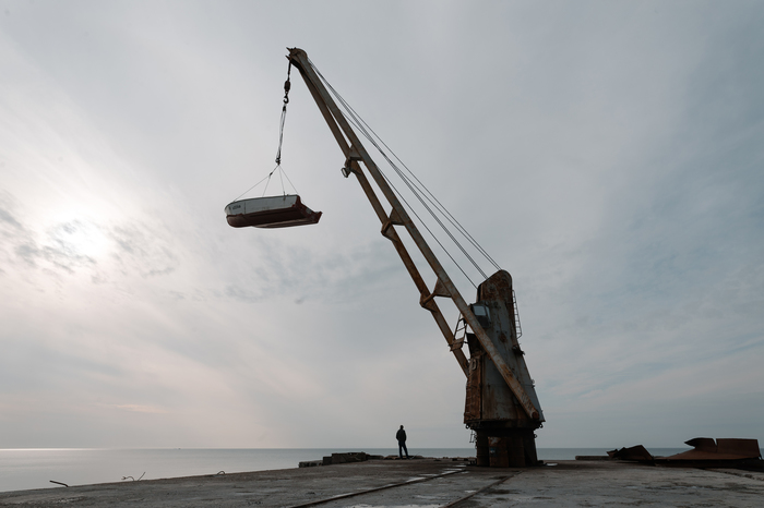 Заброшенный кран на пирсе. А сам пирс действующий - отсюда перевозят абхазский лес в Турцию. Не смотря на не особо теплую погоду - было градусов 12 в море купались какие-то ребята.