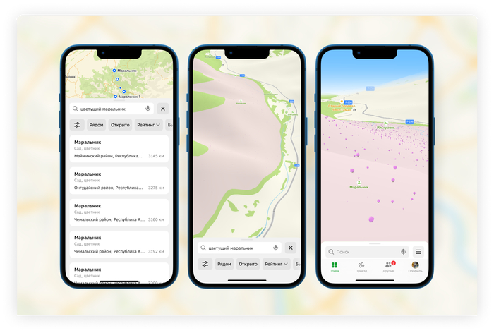 Кроме сакур в 2ГИС зацвёл и рододендрон Ледебура, более известный как маральник или сибирский багульник. Он – одна из природных достопримечательностей Алтая. Во время цветения маральника и без того живописные склоны гор окрашиваются в лилово-розовый цвет. В сезон цветения сюда приезжают целые туристические группы. Найти цветущие поляны поможет 2ГИС – просто введите запрос «цветущий маральник».