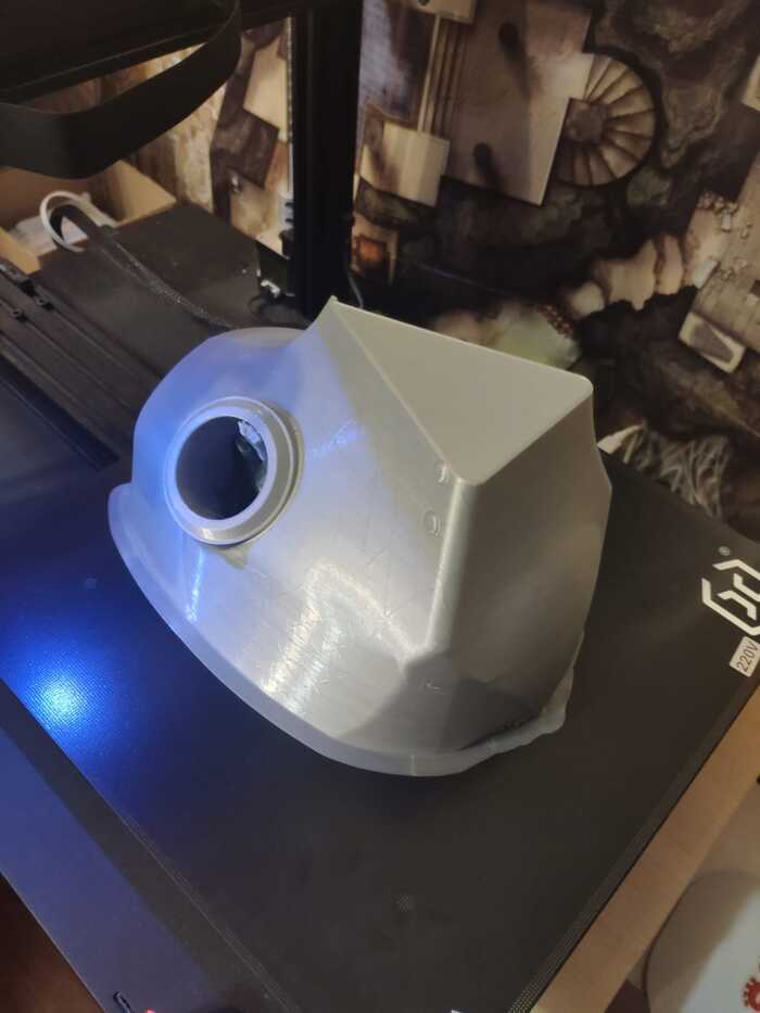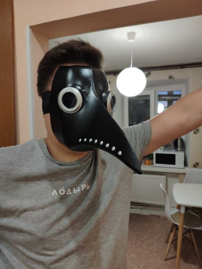 Выглядит основная часть как странный противогаз. Клюв печатали отдельно, из другого пластика. Так появилась птичья личность моего мужа.