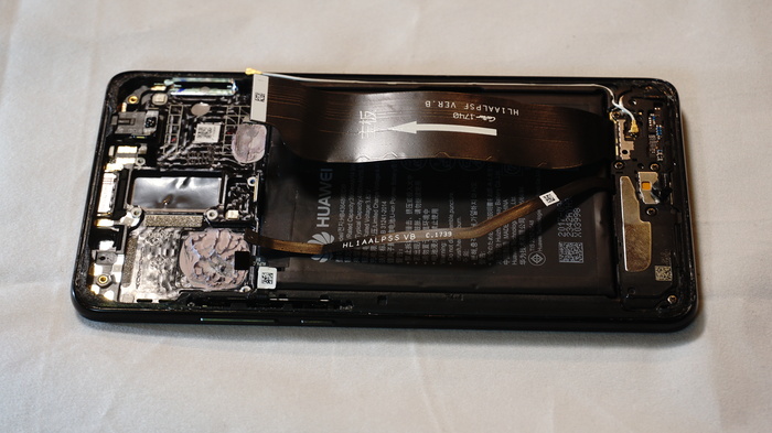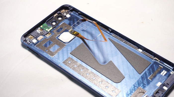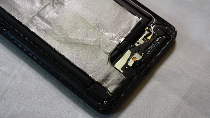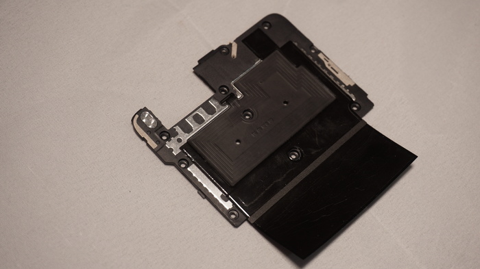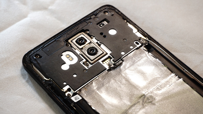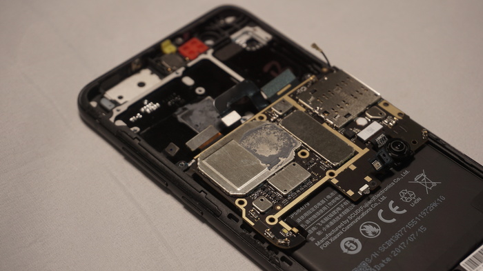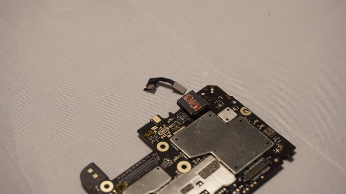 На обратной стороне платы расположились шлейф двойной камеры, и защитные экраны, на которых щедро нанесена термопаста, естественно для более лучшей отдачи тепла от жизненноважных микросхем смартфона.
