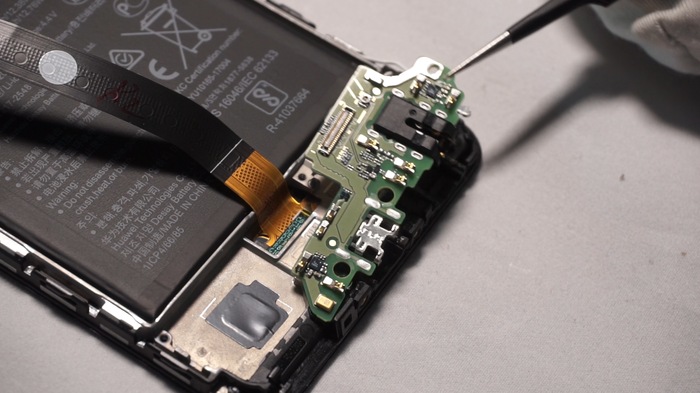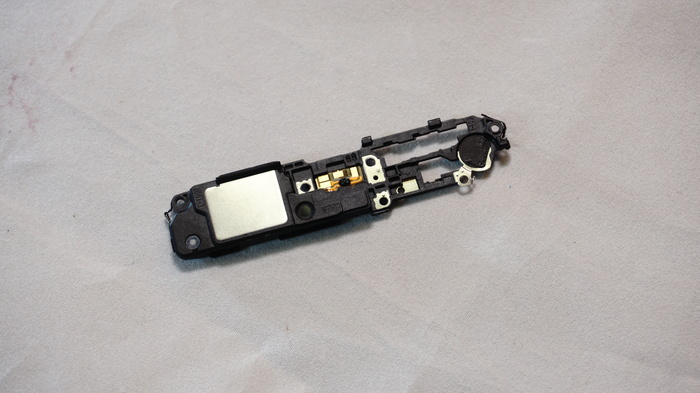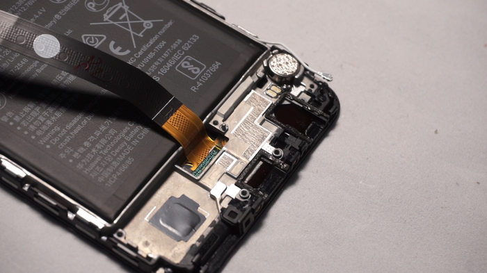 Винты в нижней части смартфона, о которых мы говорили ранее, убираем. Первым делом отсоединяем коаксиальный кабель. Снимаем с клипс рамку нижней вспомогательной платы. Кстати, прямо на ней установлен динамик, который может несколько затруднить извлечение. Поэтому стараемся сделать это без резких движений. После становится свободен и межплатный шлейф с дополнительной платой. Нам открылись дактилоскопический датчик и вибромотор.