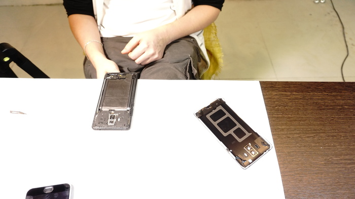 Переворачиваем и демонтируем фронтальную камеру с ее законного места. Далее снимаем экраны. Самый подходящий инструмент для этого - пинцет. Советуем снимать экраны постепенно и по их контуру.