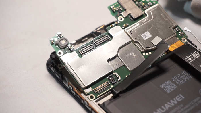 Вновь переворачиваем плату и отсоединяем коннектор основной камеры, далее удаляем оставшиеся защитные экраны. На правой стороне видим процессор Kirin 970, чуть выше основная и оперативная память. На процессоре опять же достаточно много термопасты. И не только на нем, кстати. С левой стороны сим-ридер.