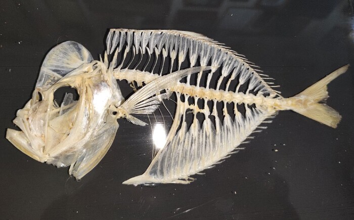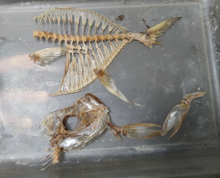 Скелеты и черепа рыб делать сложнее, чем скелеты и черепа наземных позвоночных: уж очень рыбы разваливаться любят. Собственно, при варке они разваливаются в кашу, это вы, наверное, все наблюдали. При мацерации происходит то же самое. А вот с помощью жуков их очистить худо-бедно получается.