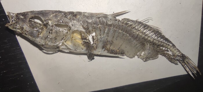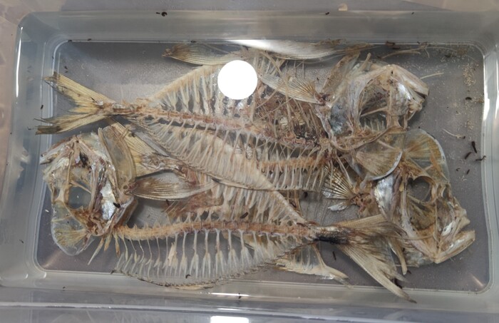 Месяц назад я сделал очередную попытку почистить рыбьи скелеты. Купил мороженных вомеров, счистил большую часть кожи и мяса и почти сутки сушил в электродуховке примерно при 60 °С. И по одной штуке скормил жукам, в картонной ванночке, чтоб кости не рассыпались по всему террариуму.