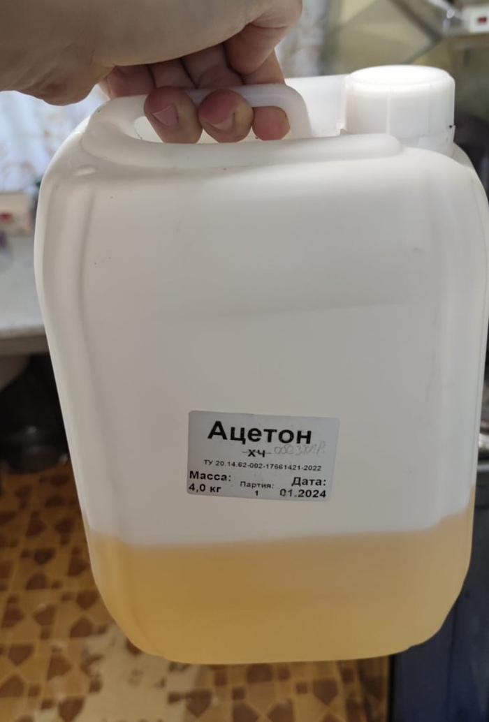 Сделать фотографию скелетов в жёлтом ацетоне я не подумал, но вот как выглядит он в канистре - и это несколько литров растворителя на четыре маленьких скелетика:
