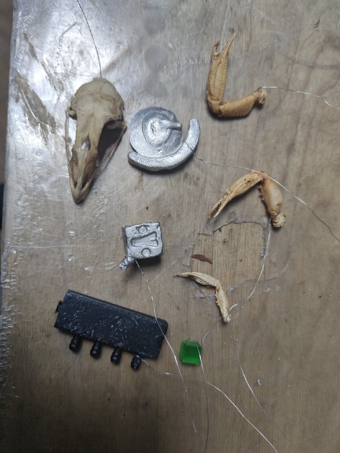 Наскрёб по закромам всякого мусора - пару распечаток с фотополимерного принтера, кусок цинка, кусок алюминия, куриный череп и несколько крабовых клешней. Всё обезжирил ацетоном, к каждой штучке подклеил цианакрилатом кусок лужёной медной проволоки.