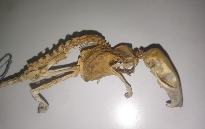 А вот эта мышка, найденная в углу лаборатории, показывает, как выглядят "скелеты в пещерах". Обратите внимание на отсутствие нижней челюсти и остатки мышц в грудной клетке: скелет опять начал разрушаться быстрее, чем полностью очистился. Потом, правда, засох, и в таком виде сохранился в веках годах.
