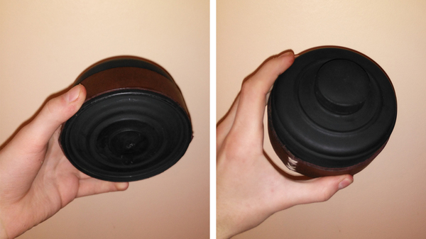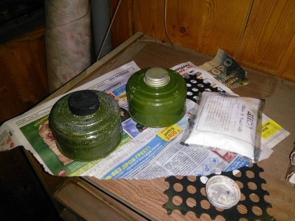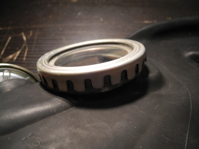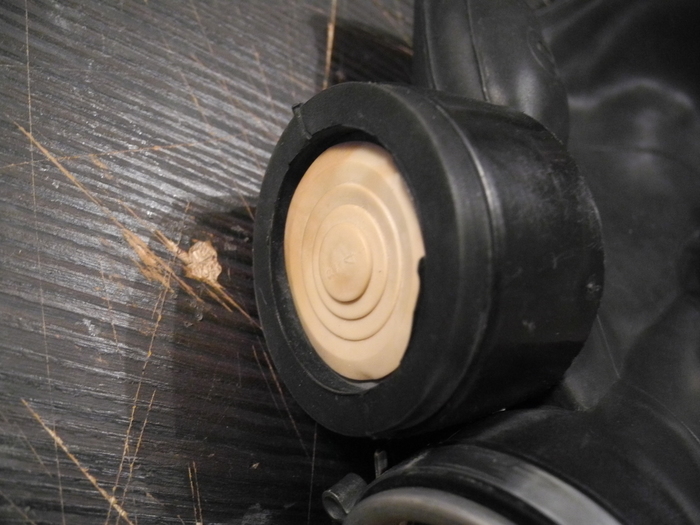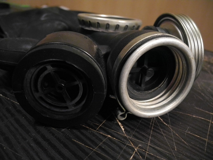 Также внимательный читатель заметит, что крышечка на левом фильтре не родная - и будет совершенно прав! Родная крышечка лежит неподалеку, т.к. она проржавела уже насквозь. Но где же найти крышку с резьбой для противогазного фильтра? Открутить от другого фильтра, конечно! Но если такой вариант по каким-то причинам не приемлем, то есть другой выход... Хозяйке на заметку: резьба на баночке от витаминок "Компливит" идеально подходит для противогазов. Это значит, что крышечки можно навинчивать на фильтры, а саму баночку, начинив активированным углем, невозбранно и герметично привинчивать к противогазам и гофра-трубкам.