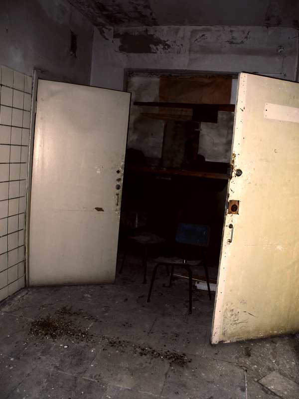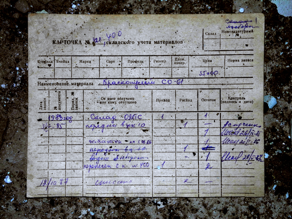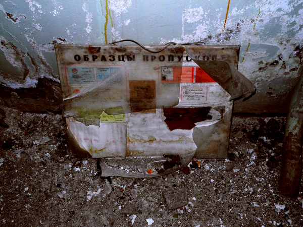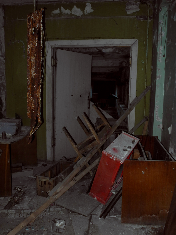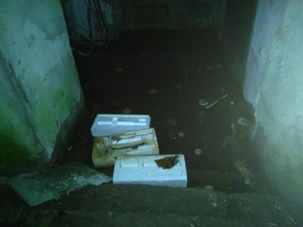 На обратном пути я заглянул в бомбоубежище. Вход туда сейчас больше похож на деревенский сортир, да и внутри тоже мало интересного — тесное полузатопленное помещение, ближе к лестнице валяются пустые аптечки АИ-2 и плавают фильтры ГП-5. Без высоких крепких резиновых сапог делать там было нечего. Доставать фотоаппарат ради этого унылого зрелища тоже не хотелось, и я ограничился камерой мобильного телефона.