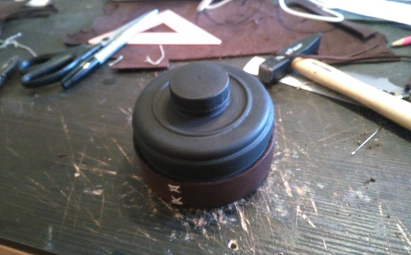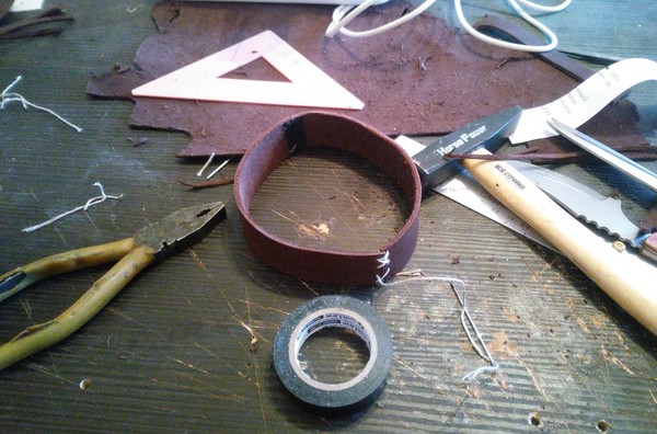 Ждем пока высохнет, а тем временем готовим декоративные элементы. В качестве этих элементов я вырезал две полоски из натуральной кожи и сшил их вместе толстой нитью (заодно они скроют косяки покраски):