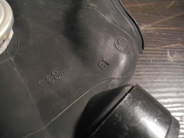 Судя по маркировкам, маска изготовлена во втором квартале 1989 года на Ярославском заводе РТИ. Размер у нее нулевой, т.е. самый маленький (и самый редкий), наверное, предусматривалась для детей ракетчиков.