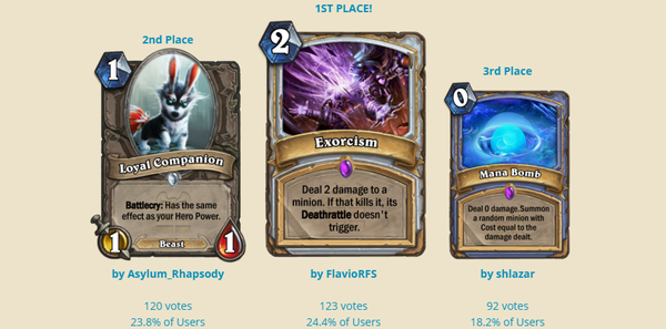 Сам конкурс проводился на сайте Hearthpwn, сама идея состояла в том чтобы комьюнити Heartstone создало свои 2Д карты, а уже Myminifactory создало физическую версию карты победителя. Вот топ 3 конкурса