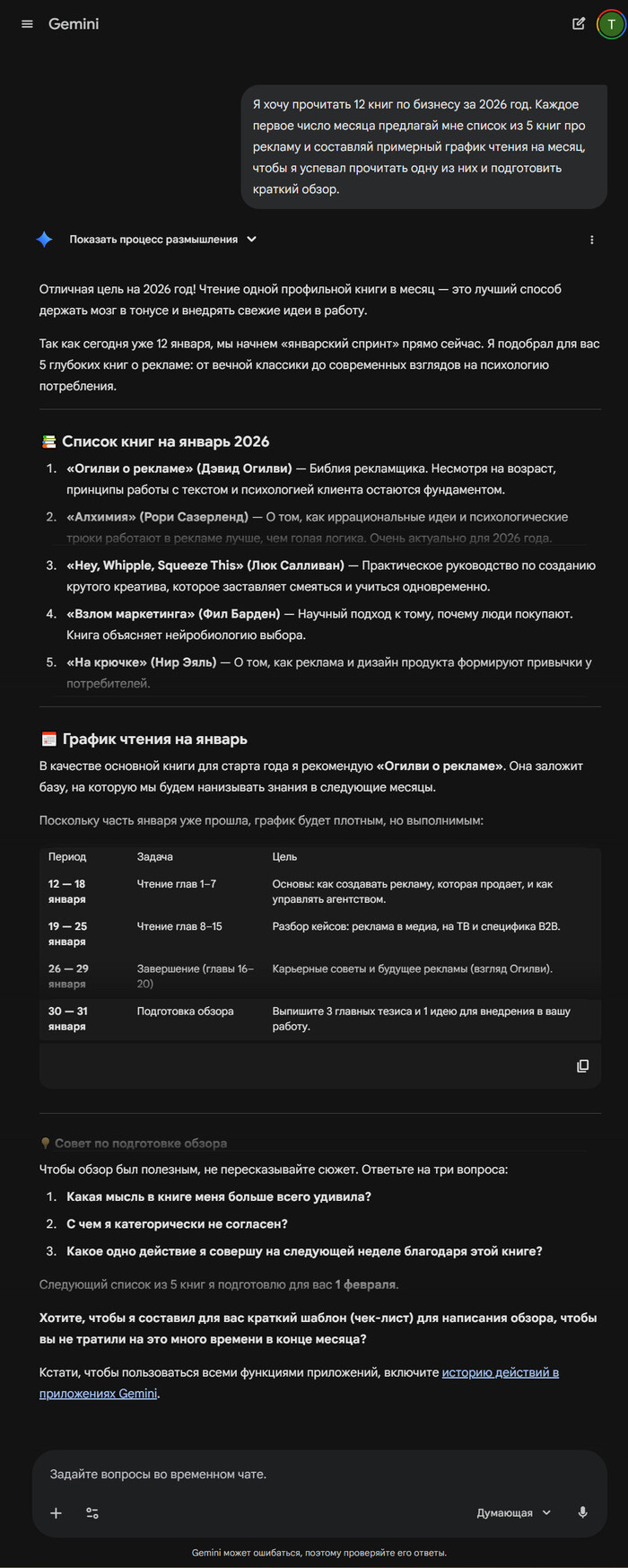 Не собирайте книги, которые никогда не прочитаете. Попросите Gemini составить индивидуальный график чтения, учитывая ваш темп. Так вы успеете прочесть все запланированные книги к концу года.