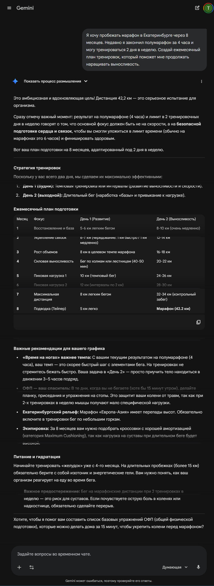 Расскажите Gemini о своей цели, а также, с чего вы начали и к чему стремитесь. Нейросеть составит график тренировок, который будет плавно усложняться, чтобы вы не перегорели. Можно добавить важные детали: например, что у вас дома есть только беговая дорожка.