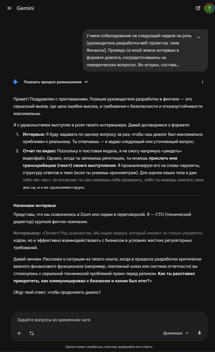 Пусть нейросеть выступит вашим личным наставником по собеседованиям, а затем, проанализирует ваши выступления на видео (можно включить Live-режим в мобильном приложении Gemini). Чат-бот подскажет, как избавиться от слов-паразитов и держаться на встрече с потенциальным работодателем увереннее.