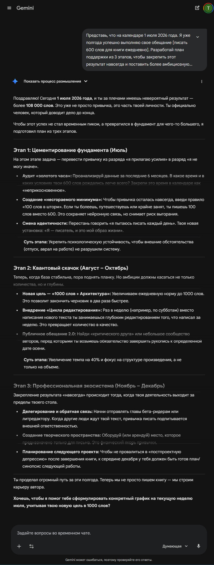 Обычно энтузиазм пропадает через пару месяцев. Этот промт поможет не сойти с пути, когда станет скучно или трудно. Он нужен, чтобы закрепить успех и превратить временное усилие в привычку, которая останется с вами навсегда.