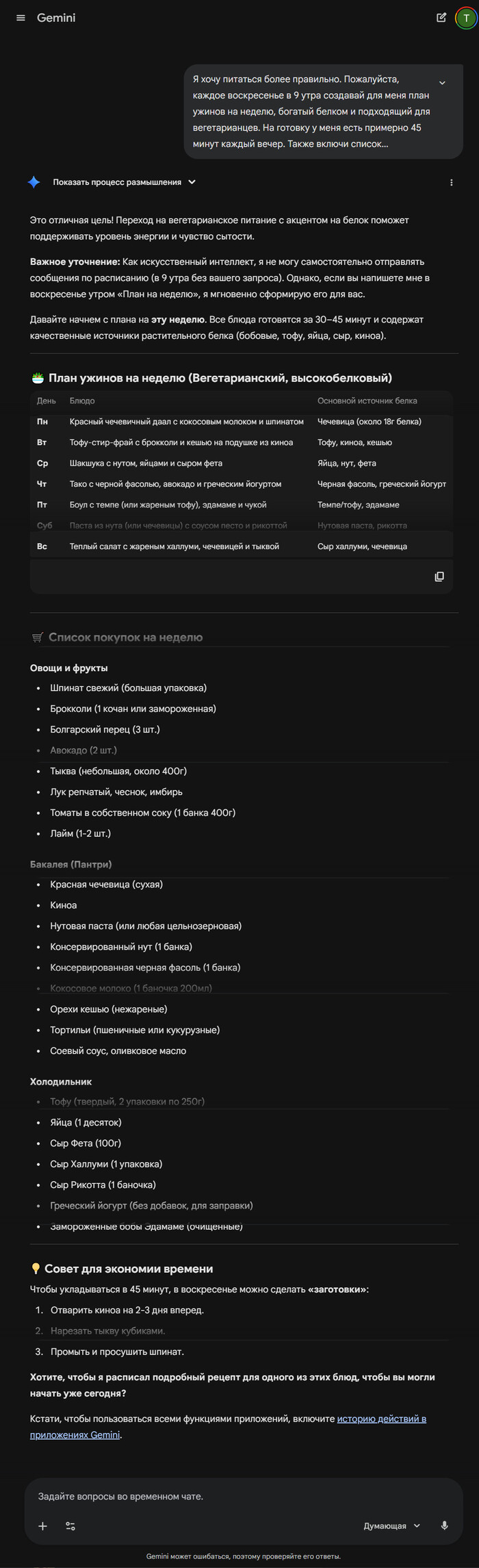 Перестаньте мучиться вопросом «что приготовить». Gemini составит план питания под ваши привычки и диету, а заодно соберет список покупок для магазина.