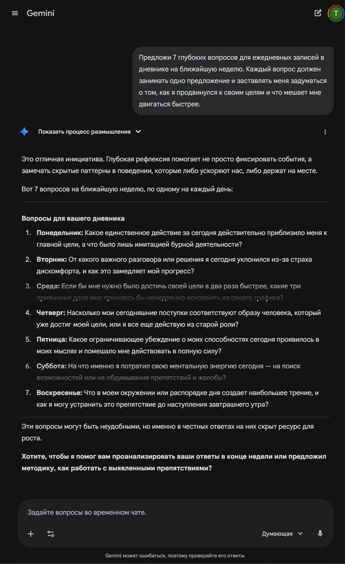 Если хотите вести дневник, но боитесь «чистого листа», используйте ИИ как личного коуча. Нейросеть напишет точные вопросы, которые помогут «выгрузить» мысли из вашей головы и лучше понять свои истинные мотивы.